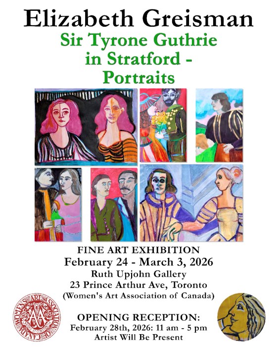 Elizabeth Greisman is honored to share her fine art exhibition titled “Sir Tyrone Guthrie in Stratford – Portraits” for the Women’s Art Association of Canada which ran from February 24 to March 3, 2026 at the Ruth Upjohn Gallery in Yorkville, Toronto, Ontario, Canada.